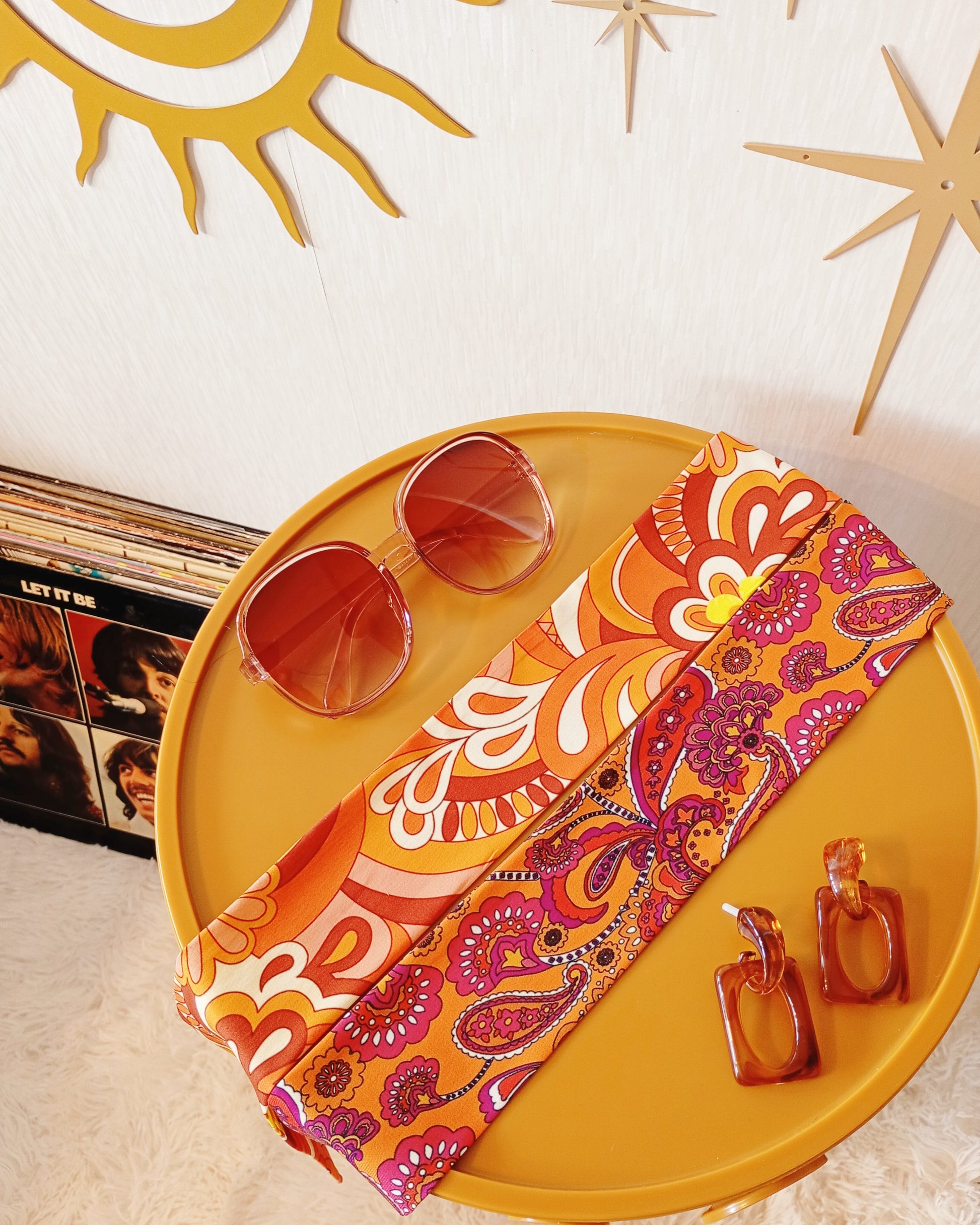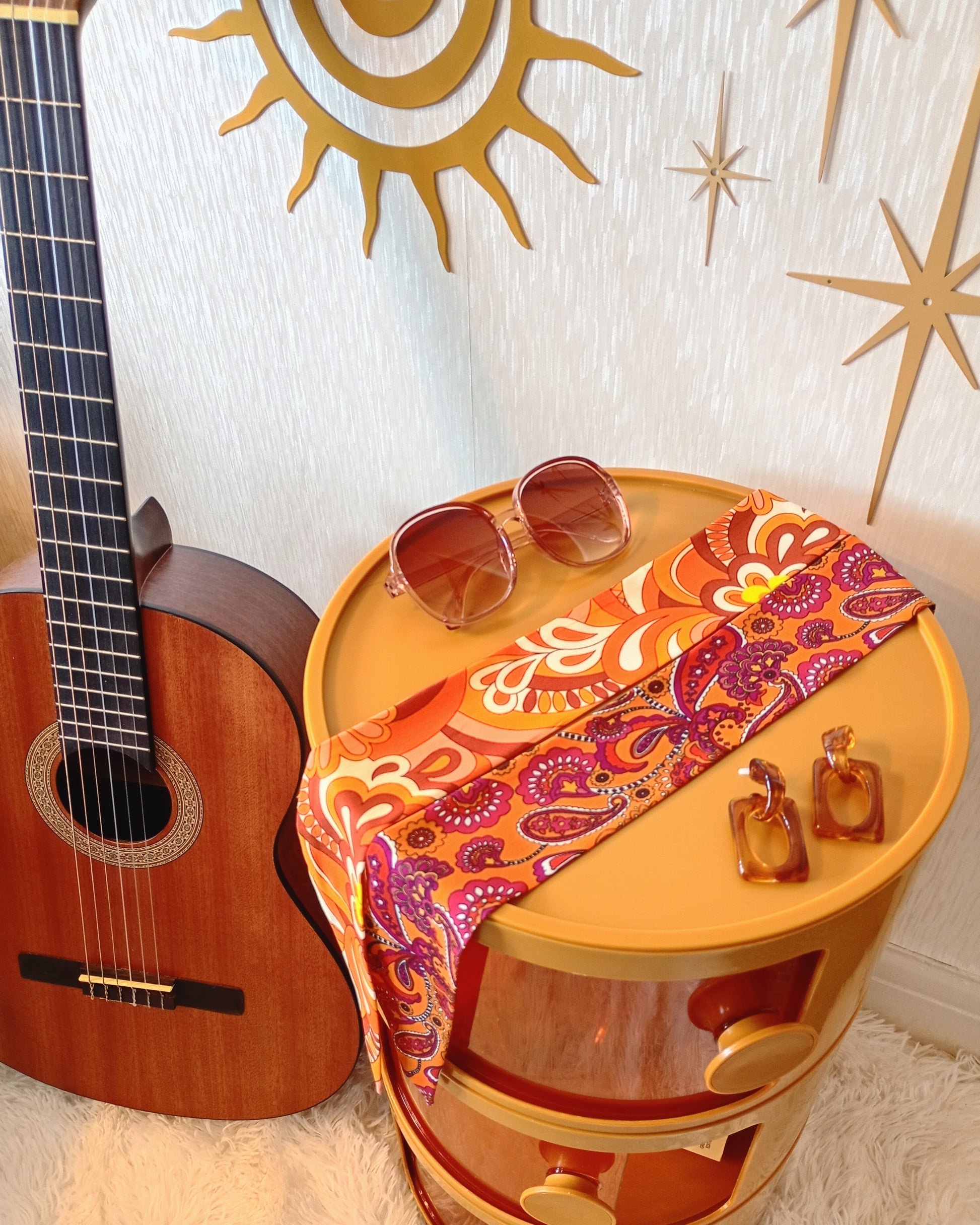 Our 'Cosmic Empire' skinny scarf is a mod paisley dream, inspired by the groovy paisley patterns of the sixties and seventies and with vibrant and stand out colour and design that will set you apart from the crowd. If you're looking for a way to add a touch of vintage elegance to your everyday style , this double side scarf is one of the most versatile and luxurious hair and neck accessories you can own. Made from silky and comfortable fabric and vibrant and colourful prints.