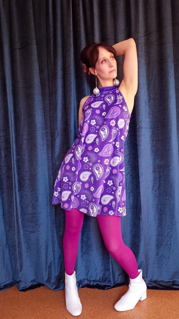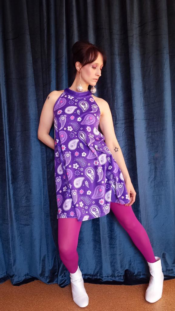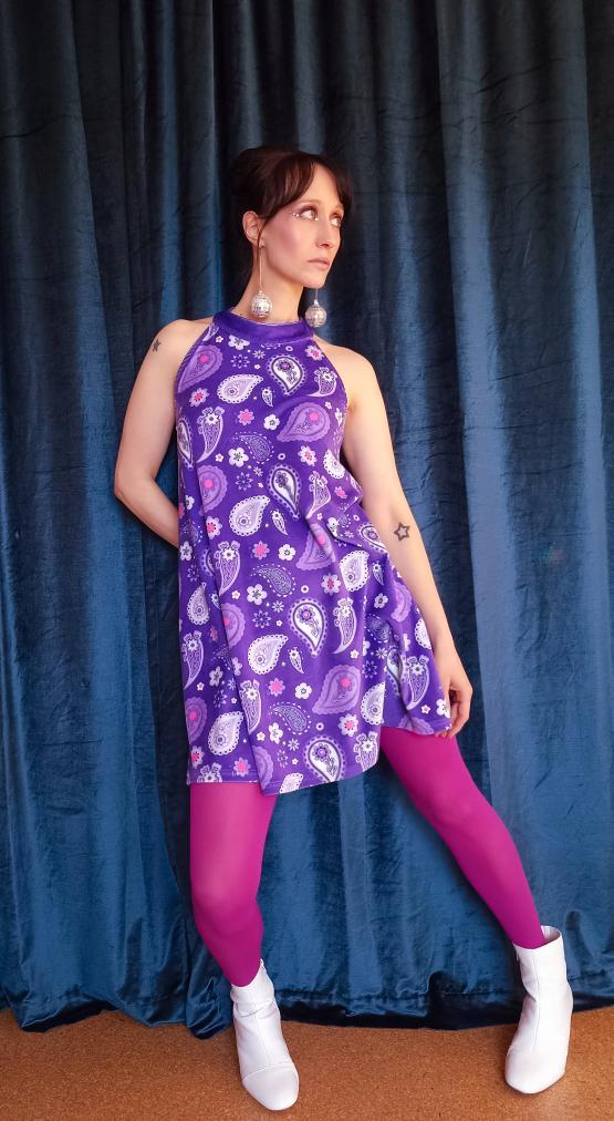 Get lost in space in our purple, paisley, intergalactic mini! With paisley's and flowers adorned like stars across this elegant, flowy chiffon halter, she's a mix of Mod and space age! Perfect for those disco nights out or days spent with friends who love retro, mod and space age just as much as you.