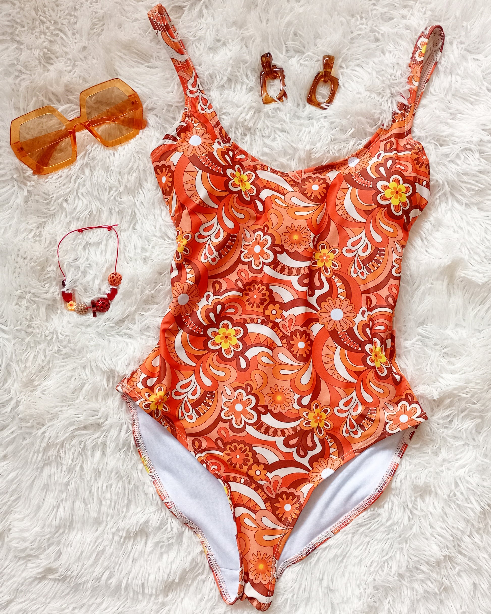 Get ready for your holidays in the sun with our 'Orange Skies' one piece swimsuit. An orange, dopamine, Palm Springs dream swimming costume, adorning those flowers and paisley swirls we love so much! Made from soft and stretchy recycled polyester, this eco-friendly one suit is a staple swimwear piece. The combination of comfort, colour and nostalgic print makes this suit a must-have for any retro swimwear collection.
